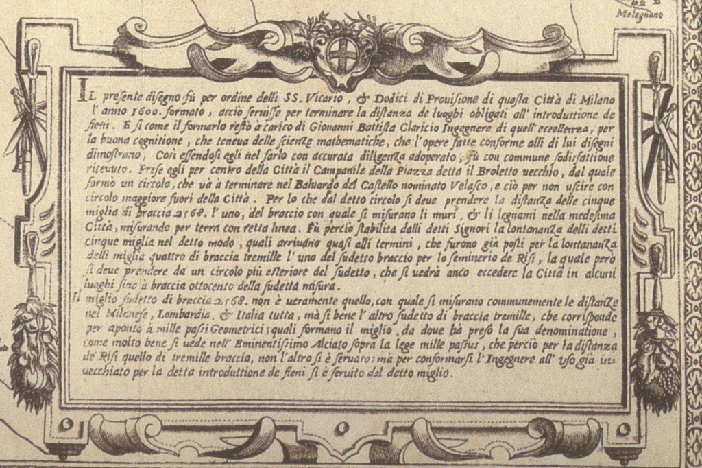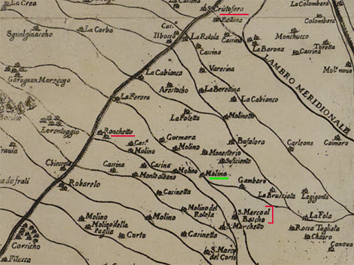 Inoltre, il Molino risulta denominato semplicemente “Molino” nella “Carta dei dintorni di Milano” del 1600 predisposta dall’ingegner Giovanni Battista Claricio, conservata all’Archivio Storico Civico e ristampata fino al 1682. Questa Carta, che si estende per un “raggio di cinque miglia” dal centro della città, era destinata a uso fiscale e riportava con precisione cascine, torchi e mulini, obbligati a fornire prodotti a Milano sotto la dominazione spagnola.