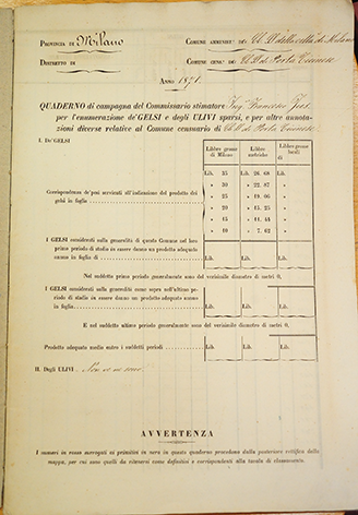 Segnaliamo infine che, all’epoca del grande sviluppo della filatura della seta, le autorità guardavano con molta attenzione alle piante di gelso in quanto solo di esse si alimentava il baco da seta, tanto che venivano pubblicate apposite stime dei gelsi censibili denominate “Quaderno dei Gelsi”: qui presentiamo quello del 1881, nella parte dedicata al Mandamento VIII di Milano – Corpi Santi Porta Ticinese, redatto dallo stimatore ing. Francesco Jus e conservato all’Archivio di Stato, dal quale apprendiamo che la misurazione delle foglie dei gelsi avveniva in libbre e che il prezzo medio era di Lire 7. vedi foto sotto